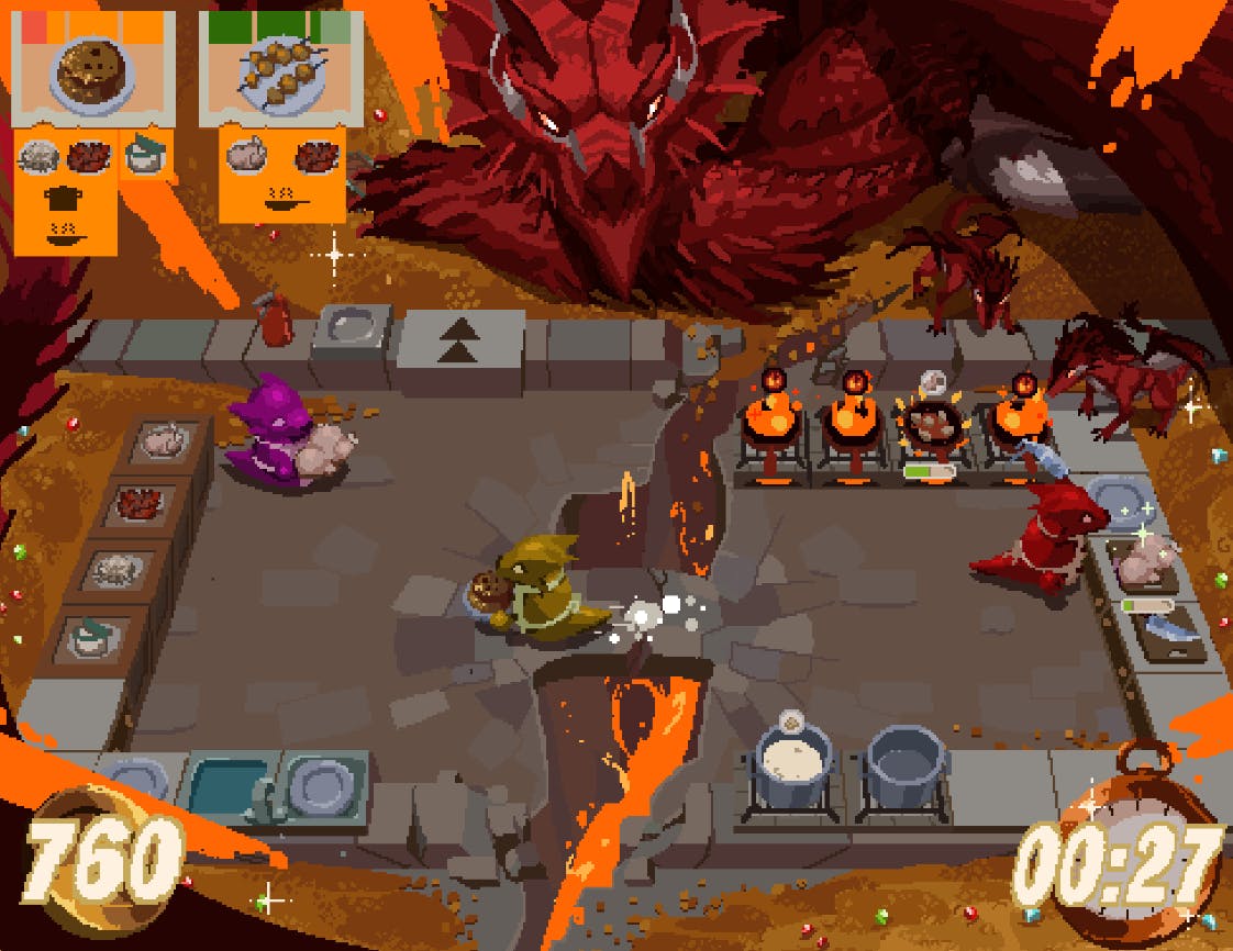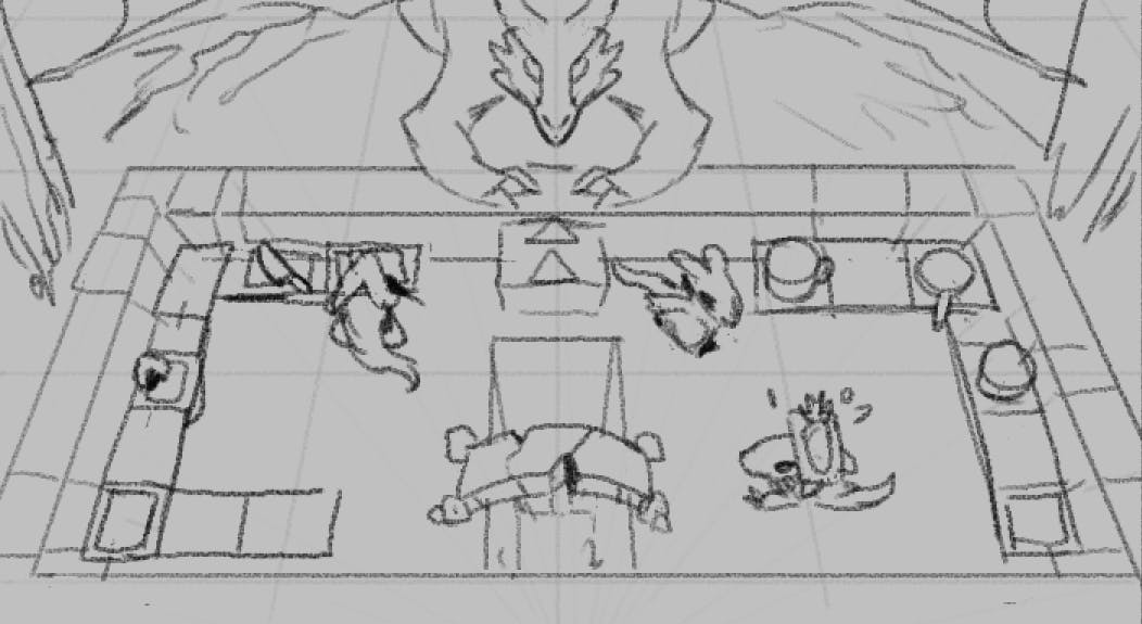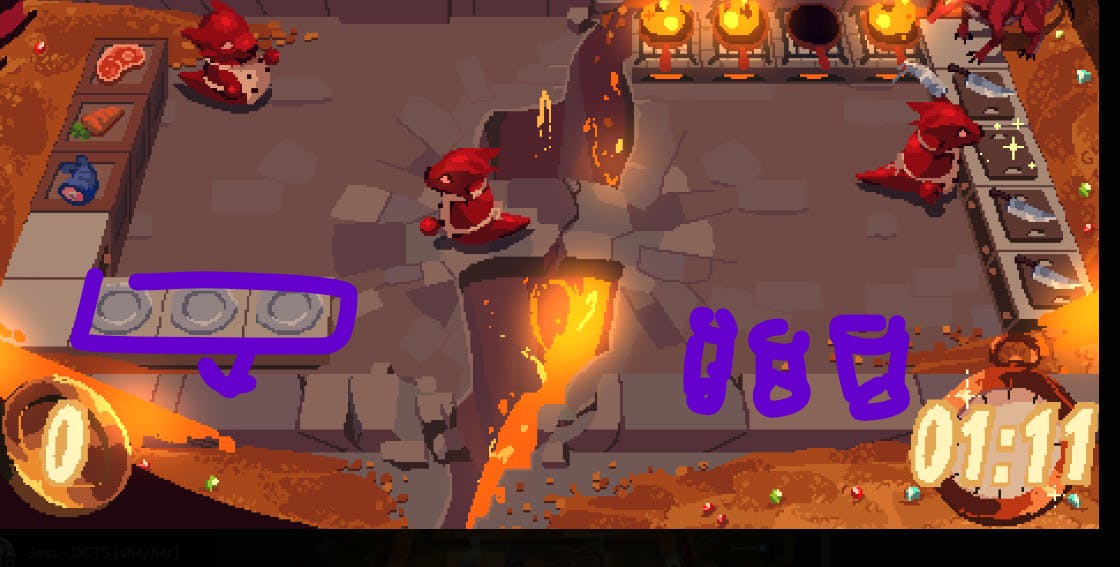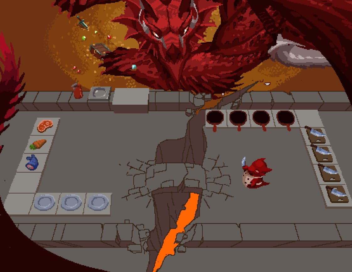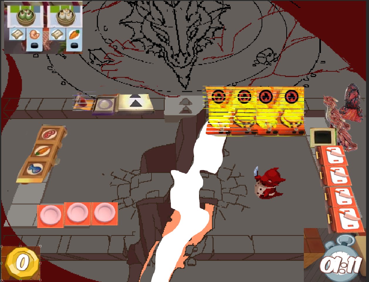 Using some maps of overcooked as inspiration (and adjusting to a wide page layout.) Initially I was thinking something like the horde mode where we'd have wyrmlings on the sides, but instead we opted for a more 'boss mode' where you're feeding the dragon, and the little wymlings may interefere (burning or eating things on the stove).